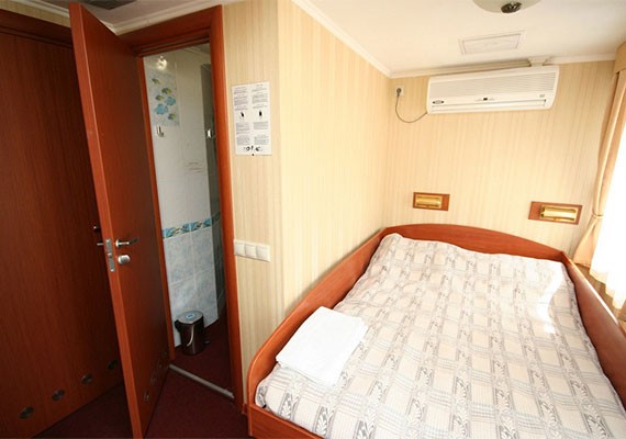 Одноместные каюты на главной и средней палубе. Некоторые каюты оборудованы двуспальной кроватью с возможностью дополнительного размещения. Площадь: 7,1-7,4 кв.м.