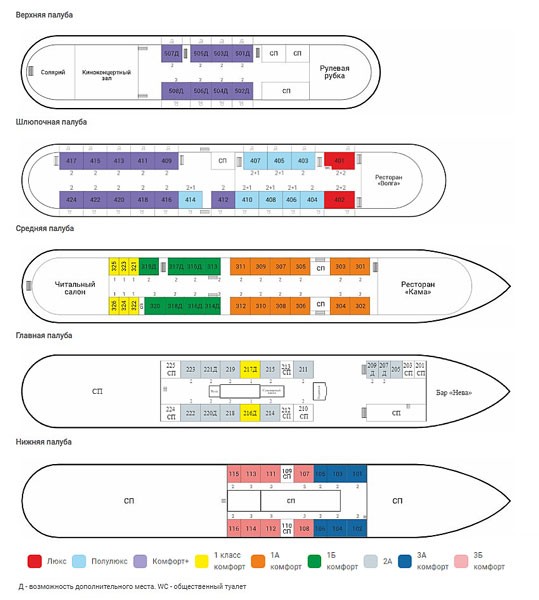 Во всех каютах теплохода «Хирург Разумовский» есть есть телевизор, холодильник, душ и туалет, кондиционер, шкаф для одежды. Ниже приведено описание и фото кают, доступных для размещения.