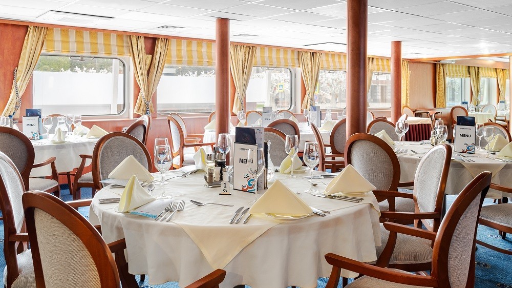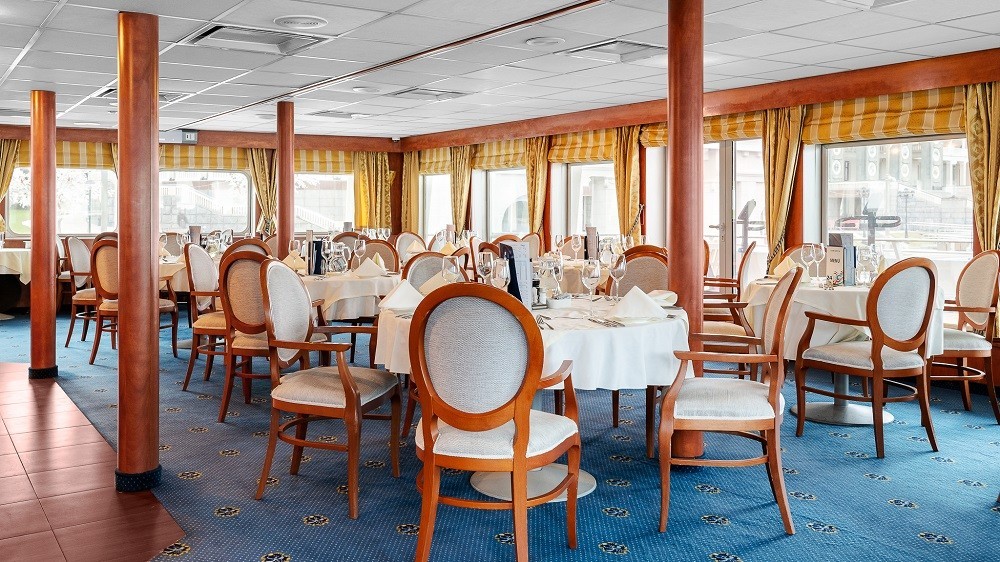 На борту теплохода вас встретит просторный и элегантный ресторан, расположенный на средней палубе. Трижды в день здесь будут подаваться изысканные блюда, созданные шеф-поваром компании «Созвездие». Завтрак в каюту – услуга, включенная в стоимость для всех туристов.
